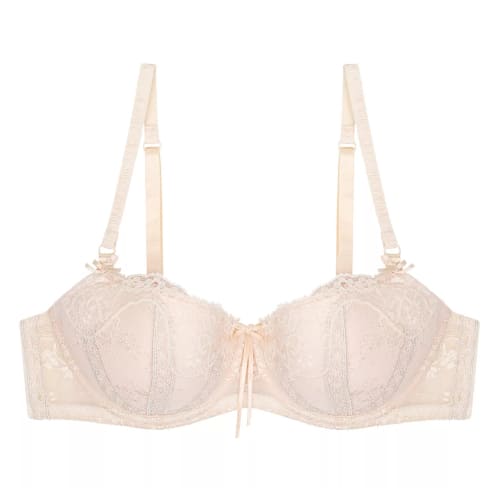 Rendered in sheer lace with an elegant ribbon‑style detail at the center, this underwire bra offers both full‑frame support and romantic charm.